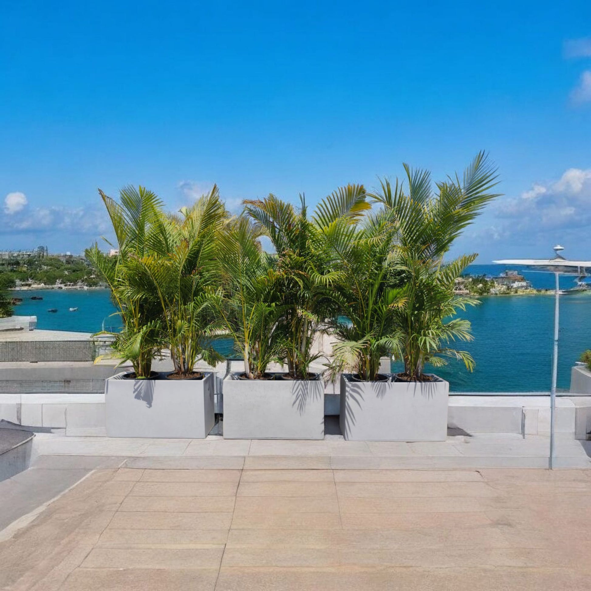 Transformez votre terrasse en oasis privée avec 3 jardinières prêtes à l’emploi, chacune plantée de 2 palmiers Erika adultes de 2 mètres.